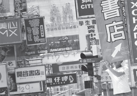 A worker adjusts a promotional sign in Mong Kok. The city's Consumer Price Index (CPI) figures dropped 0.6 percentage point in June due to food price decline and lower rental payment growth rate. Antony Dickson / AFP Photo  |