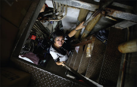 Even getting up to the second floor could be an adventure. They'd grab hold of an iron chain hanging from the ceiling, and hang on, so they wouldn't fall over, climbing the narrow stairway. Nobody sleeps up there now. They use it for storage. But the iron chain is still there, still in use, several times a day when Wu climbs up and down to fetch spare parts her brother demands.