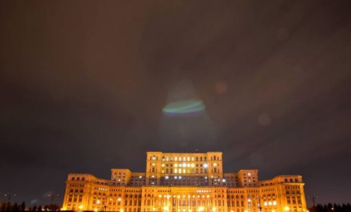 照片中,在羅馬尼亞布加勒斯特市,議會(huì)大樓燈火通明,大樓上空則驚現(xiàn)神秘光芒。這團(tuán)光圈似乎由綠色和藍(lán)色兩個(gè)橢圓形組成,重疊在一起,盤踞在議會(huì)大樓上空,乍看上去,的確和電影中的UFO無(wú)異。