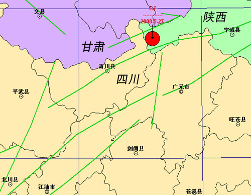 圖示為27日16時(shí)03分,四川省青川縣發(fā)生5.4級(jí)地震。(圖片來源:陜西省地震局網(wǎng)站)