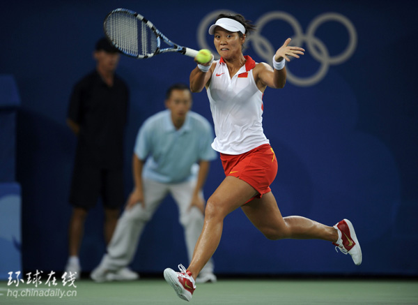 中國(guó)網(wǎng)球選手李娜在與俄羅斯名將庫(kù)茲涅佐娃的比賽中奮力一擊。