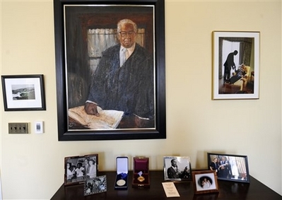 辦公室里有一扇“英雄墻”,貼的都是他欽佩的歷史人物的照片,其中有亞伯拉罕·林肯、甘地和他的紡車、馬丁·路德·金和約翰·F·肯尼迪。墻上還掛了一份加了外框的1963年華盛頓游行時(shí)日程安排的原始文件,金正是在那次游行過程中發(fā)表了《我有一個(gè)夢(mèng)想》的演講。