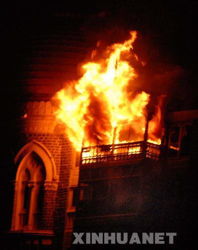11月27日凌晨,印度孟買遭到恐怖襲擊的泰姬瑪哈酒店濃煙滾滾。新華社發(fā)