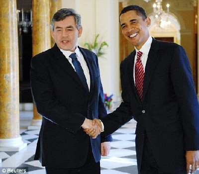 英國首相布朗與還是美國總統(tǒng)候選人的奧巴馬去年4月會晤時的情景。