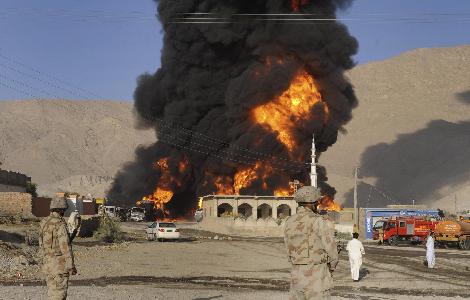 綜合外國(guó)媒體報(bào)道,當(dāng)?shù)貢r(shí)間10月6日,一伙不明身份的武裝分子在巴基斯坦西南部襲擊了為北約駐阿富汗部隊(duì)運(yùn)送給養(yǎng)的車隊(duì),造成至少25輛油罐車報(bào)廢和一名司機(jī)死亡。這是近一周以來發(fā)生在巴境內(nèi)的第六起針對(duì)北約后勤車隊(duì)的襲擊事件。