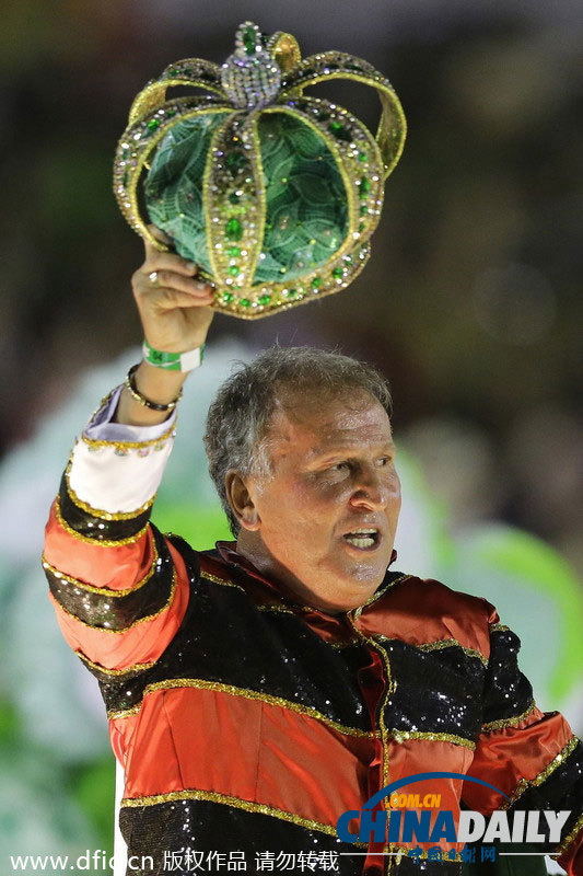 當?shù)貢r間2014年3月4日,巴西里約熱內(nèi)盧,巴西一年一度的狂歡節(jié)游行繼續(xù)舉行,足球元素充斥其中,濟科和里維利諾兩大足球名將為游覽車保駕護航。圖為濟科在跳舞。 (圖片:東方IC)