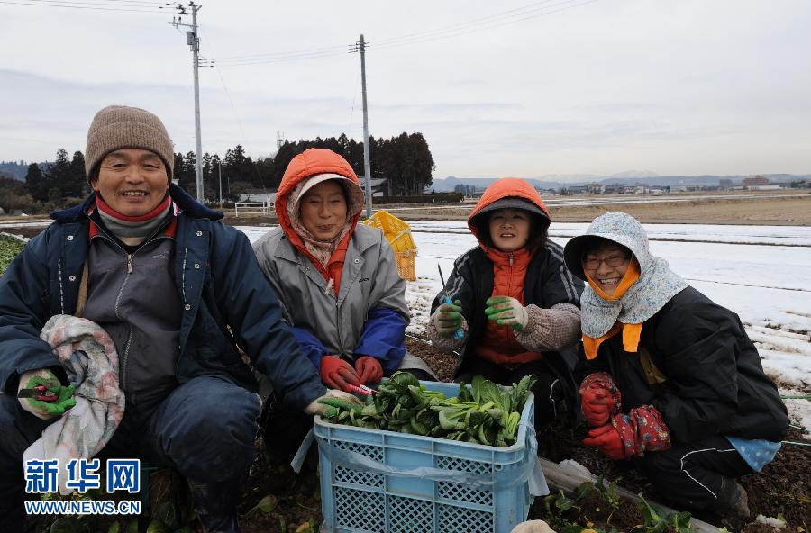 3月2日,在日本宮城縣北釜村,當(dāng)?shù)剞r(nóng)民采摘小松菜。新華社記者馬平攝