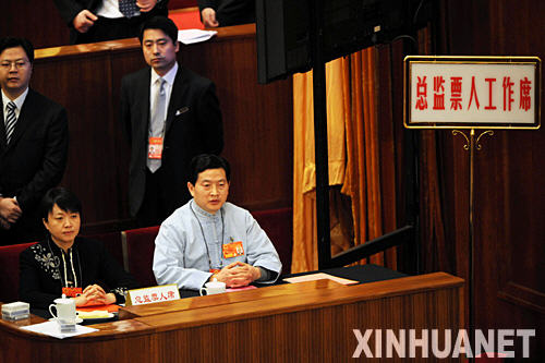 3月15日,十一屆全國人大一次會(huì)議在北京人民大會(huì)堂舉行第五次全體會(huì)議,選舉第十一屆全國人民代表大會(huì)常務(wù)委員會(huì)委員長、副委員長、秘書長;選舉第十一屆全國人民代表大會(huì)常務(wù)委員會(huì)委員;選舉中華人民共和國主席、副主席;選舉中華人民共和國中央軍事委員會(huì)主席。這是總監(jiān)票人工作席。新華社記者王建華攝