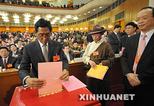 3月15日,十一屆全國(guó)人大一次會(huì)議在北京人民大會(huì)堂舉行第五次全體會(huì)議,選舉第十一屆全國(guó)人民代表大會(huì)常務(wù)委員會(huì)委員長(zhǎng)、副委員長(zhǎng)、秘書長(zhǎng);選舉第十一屆全國(guó)人民代表大會(huì)常務(wù)委員會(huì)委員;選舉中華人民共和國(guó)主席、副主席;選舉中華人民共和國(guó)中央軍事委員會(huì)主席。這是來(lái)自西藏的全國(guó)人大代表嘎瑪仁青(藏族)在投票。新華社記者馬占成攝