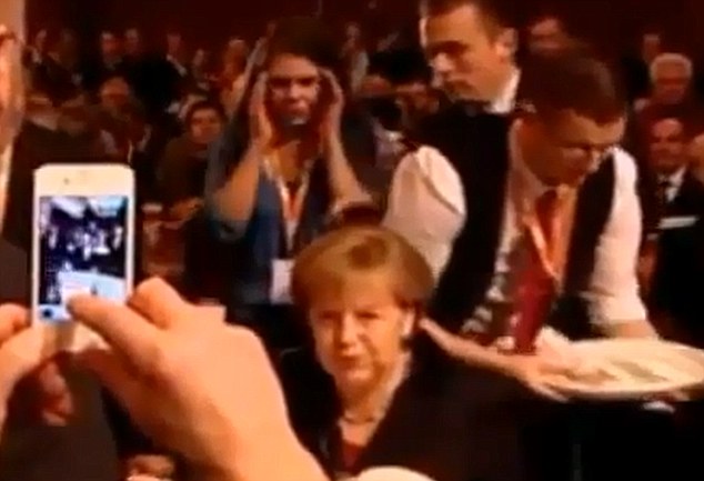 有人用手機拍攝下默克爾被啤酒“潑身”的全過程。