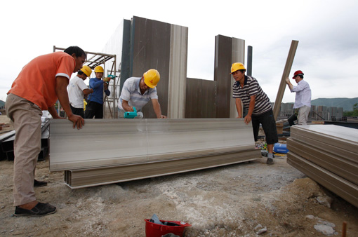 2012年7月30日,北京市房山區(qū)洪寺村,建筑工人在組裝安置房。北京房山區(qū)洪寺村受災安置房項目總建筑面積為2萬平方米,共1000間,屬于周轉(zhuǎn)安置房,為災民提供3年的居住房。