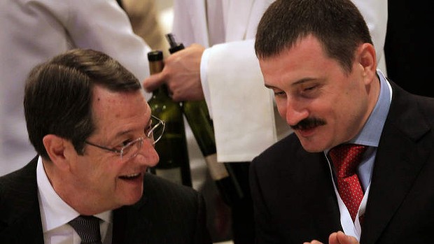 塞浦路斯總統(tǒng)尼克斯?阿納斯塔夏季斯(左)和莫斯科銀行主席(右)在利馬索爾會(huì)議上交談。