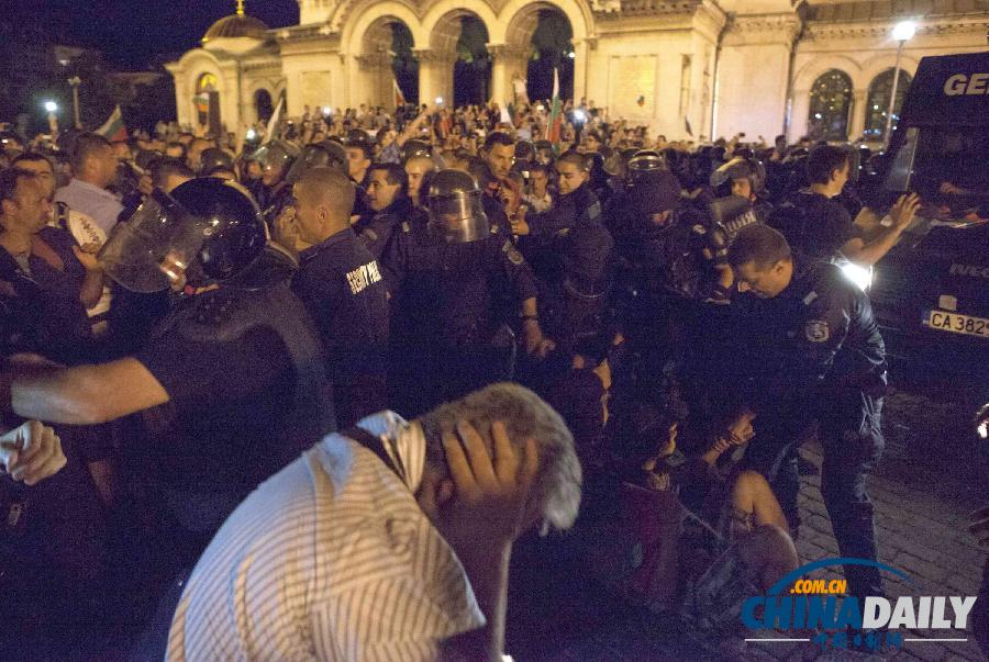 7月23日,保加利亞防暴警察在國會大樓外與示威者發(fā)生沖突。