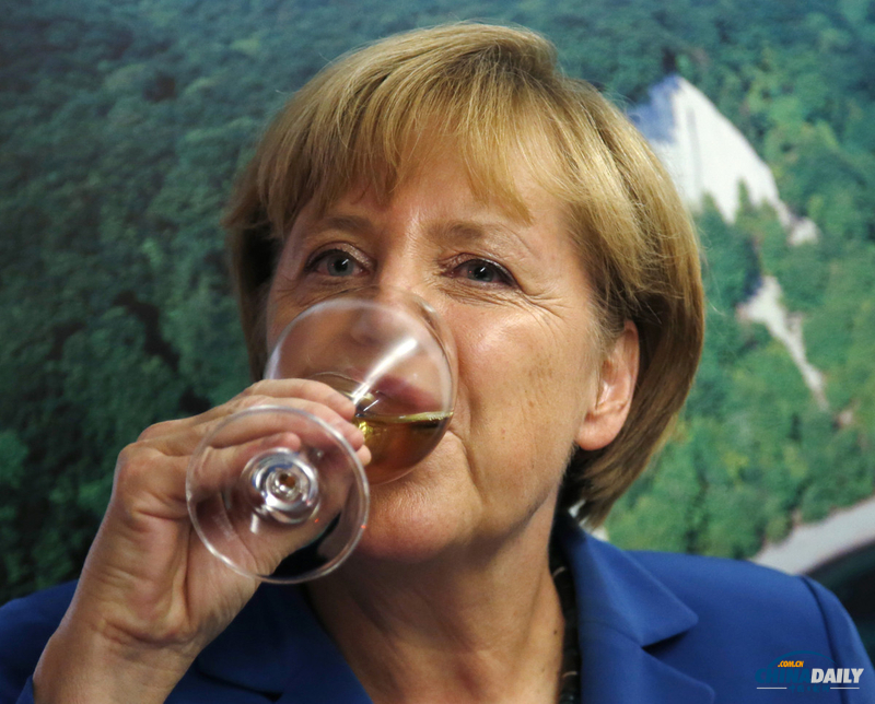 當(dāng)?shù)貢r(shí)間2013年9月22日,德國(guó)柏林,德國(guó)大選結(jié)束,默克爾將連任總理。圖中,默克爾飲酒表示慶祝。