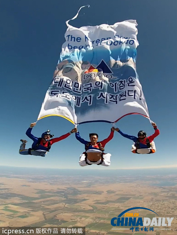 在美國加州,韓國特種部隊(duì)士兵參加跳傘活動(dòng)宣傳獨(dú)島(日本稱竹島)。