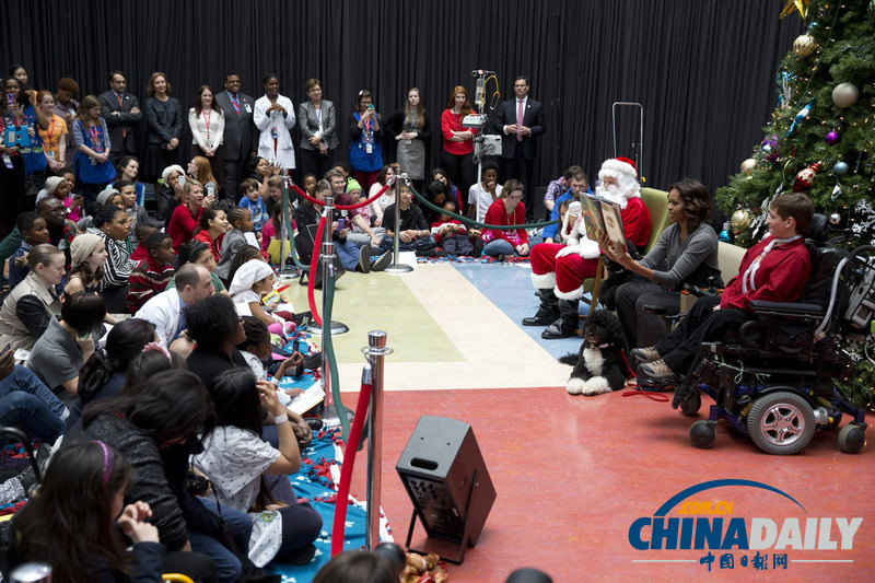| 當(dāng)?shù)貢r(shí)間2013年12月16日,美國華盛頓,美國第一夫人米歇爾-奧巴馬與“圣誕老人”訪問國家兒童醫(yī)療中心,并為孩子們講故事。 |
