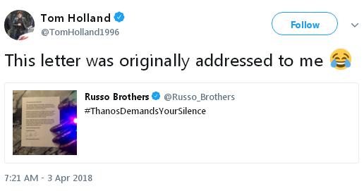 而作為劇組公認的劇透狂魔(Spoiler Fiend),片中蜘蛛俠的扮演者Tom Holland自覺轉(zhuǎn)發(fā),“這封信就是寫給我的?!?/p>