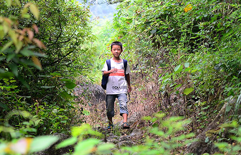 Li Jianwen carries his schoolbag and parpares to leave for the Dayandong Primary School in Dayandong village of Guzhai Mulao township in Liucheng county, Guangxi Zhuang autonomous region, Sept 4, 2017.