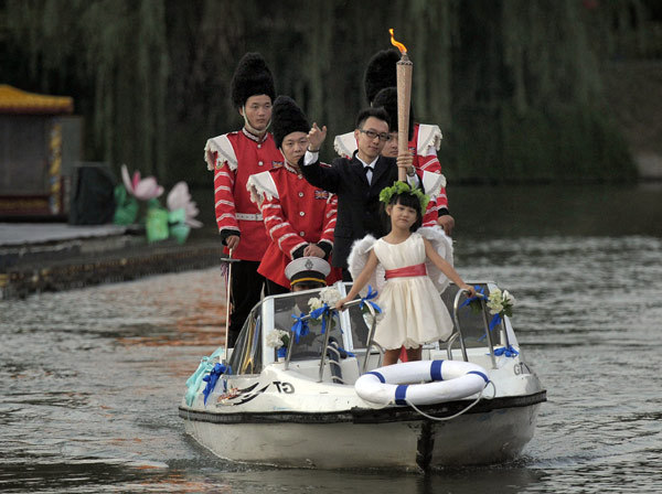 Yin Guanheng, with a torch in his hand and escorted by four men dressed like British royal guards, takes a boat to propose to his girlfriend in Bailuzhou Park in Nanjing, Jiangsu province, on Aug 6, 2012. Inspired by the Olympic torch relay by British soccer star David Beckham on the Th ames, he prepared a special proposal, which later proved a success.[Photo/Asianewsphoto] Related readings:  |