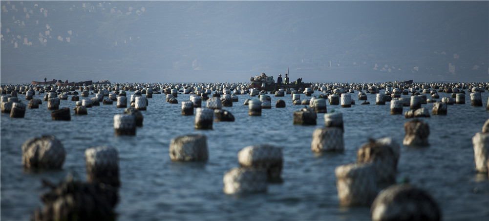• Fishing pots laid out across the bay near Guocai village