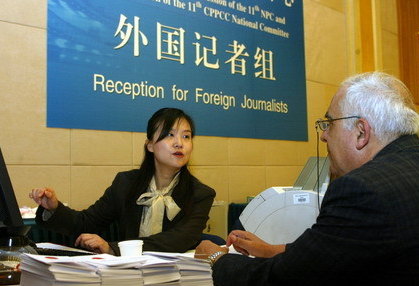 A worker at the new press center for annual sessions of the National People's Congress (NPC) and the Chinese People's Political Consultative Conference (CPPCC) handles an inquiry from Julio Hernandez Blanco, a reporter with Cuba's Latin American News Agency Friday February 29, 2008. [China Daily]