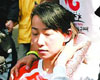 Torchbearer Jin Jing (in wheelchair), a Chinese wheelchair athlete, protects the torch from a protestor as she runs along the Seine River in the Beijing Olympic torch relay in Paris, April 7, 2008.