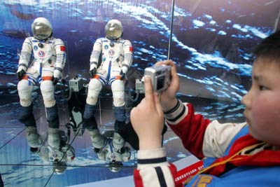 A small boy takes photo of the space suits worn by Chinese
