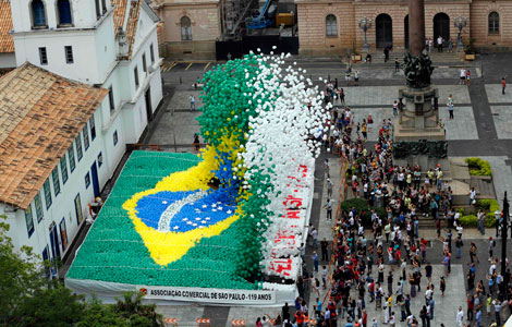 Balloons, in the form of the Brazilian national flag, are released into the skies above Sao Paulo downtown during year end celebrations Dec 30, 2013. [Photo/Agencies]