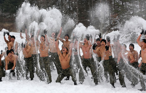 Soldiers receive physical training in the snow in Pyeongchang, South Korea, Jan 8. [Photo/icpress.cn]