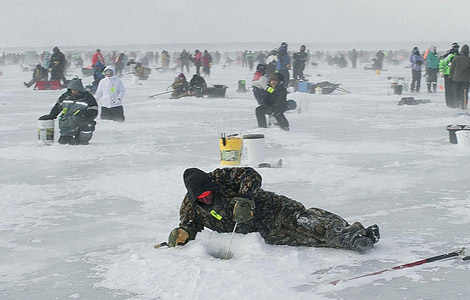 Thousands of eager anglers prepare for the best spot as the worlds largest ice fishing contest kicks off in Minnesota. More than 10,000 people will brave Baltic conditions and make the trip to Brainerd, Minnesota, US, to take part in the annual Brainerd Jaycees Ice Fishing Extravaganza. The meeting is the biggest of its kind in the world and offers a tempting cash prize of around $150,000 to the champion. The three hour event attracts huge crowds of spectators who pile on to the two square mile competition site despite blistering temperatures of less than minus 40 degrees. [Photo/icpress.cn]  |