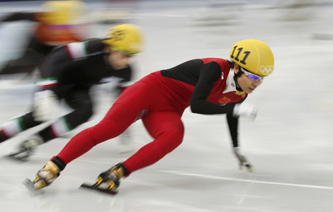 China's Janrou Li competes in the women's 3000 metres short track speed skating relay semi-final event at the Iceberg Skating Palace during the 2014 Sochi Winter Olympics Feb 10, 2014.