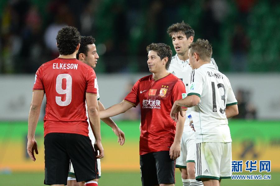 12月17日,廣州恒大隊隊員孔卡(中)在比賽結(jié)束后與拜仁球員握手。當(dāng)日,在摩洛哥阿加迪爾市進(jìn)行的世俱杯半決賽中,中國廣州恒大隊以0:3負(fù)于德國拜仁慕尼黑隊。新華社記者郭勇攝