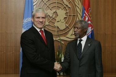 Boris Tadic, left, shakes hands with United Nations Secretary-General Kofi