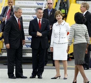 President Heinz Fischer and First Lady Laura Bush wait for US Secretary of