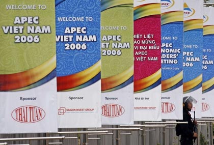 An armed policeman stands guard outside the venue of the Asia-Pacific Economic Cooperation (APEC) Summit in Hanoi November 15, 2006. Cabinet ministers from the Asia Pacific Economic Cooperation forum began talks on Wednesday seeking ways to revive comatose global trade talks and get their own Pacific rim free trade area off the drawing board. [Reuters]