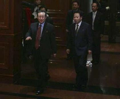 Chief North Korean negotiator Kim Kye-kwan (L) arrives for a banquet at the end of the second day six-party talks in Beijing February 9, 2007. [Reuters]