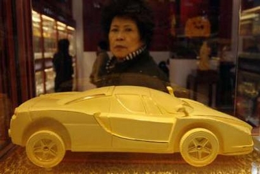 A woman looks at a gold car on display at China International Jewellery Fair in Beijing November 5, 2007. Gold dropped on Monday to track sliding crude oil prices but held firm above $800 due to a weak U.S. dollar and strong fundamentals, which could soon help the metal retest a record high of $850. [Agencies]