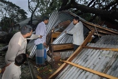 Local residents look inside a damaged class room at a school in Barishal, 120 kilometers(75 miles) south of Bangladesh's capital Friday, Nov. 16, 2007. [Agencies]
