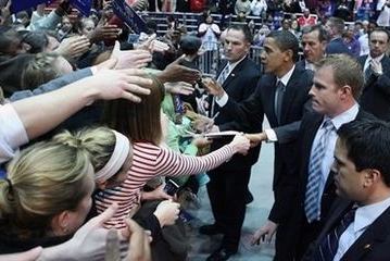 Democratic presidential hopeful Sen. Barack Obama, D-Ill., third from right, works the rope line during a rally Monday, Feb. 25, 2008, in Cincinnati, Ohio. [Agencies]