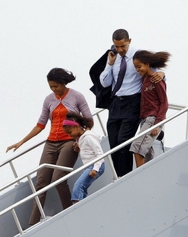 |  Democratic presidential candidate US Senator Barack Obama, his wife Michelle and daughters Malia (2ndL) and Sacha disembark from a plane at Indianapolis International Aiport in Indianapolis as he continues on the campaign trail. The tiny US Pacific island of Guam relished a rare moment in the spotlight, weighing in on the raging Democratic White House battle between Hillary Clinton and Obama. [Agencies] |