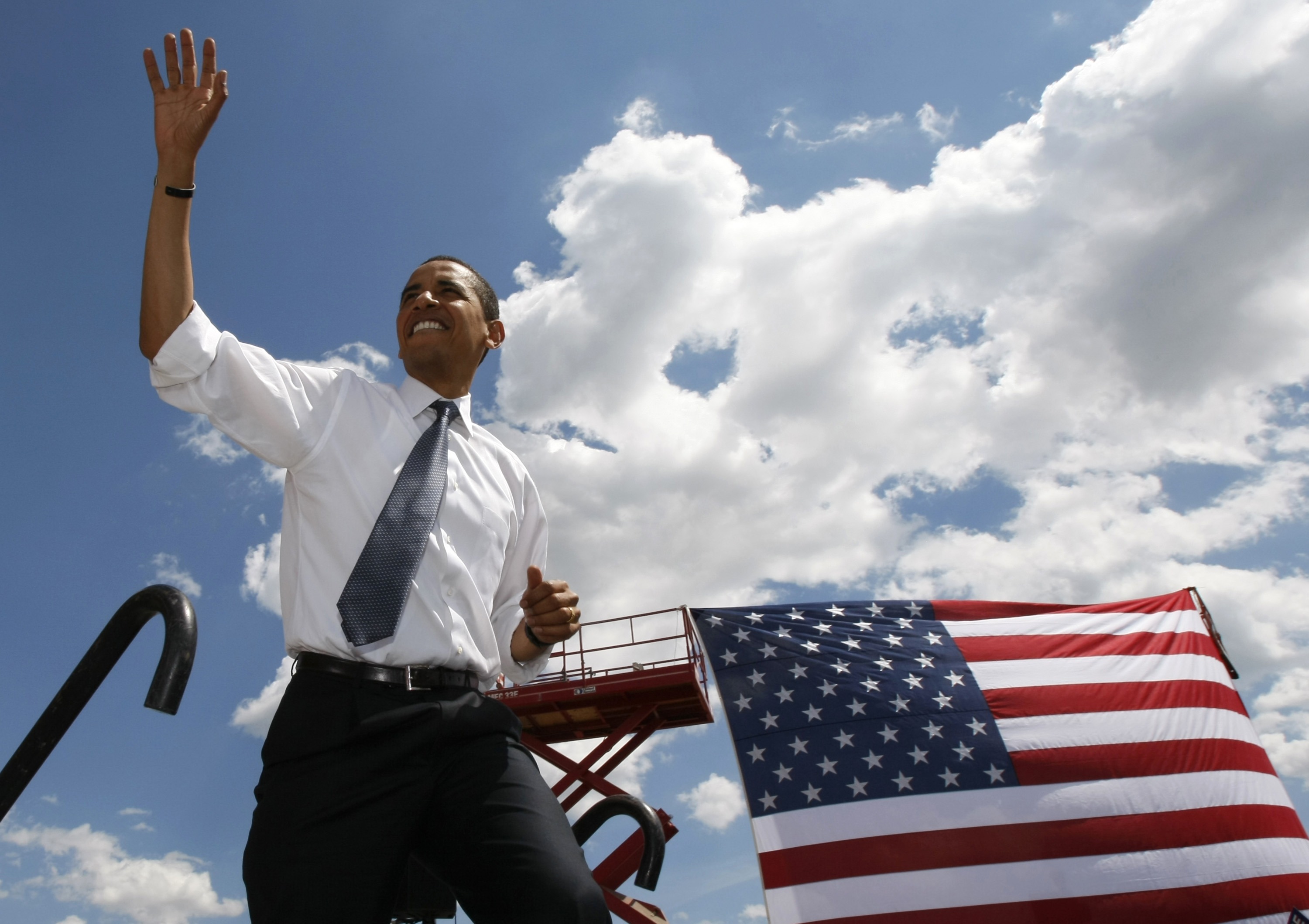 | US Democratic presidential candidate and Senator Barack Obama arrives on stage to speak in Mitchell, South Dakota June 1, 2008. [Agencies] |