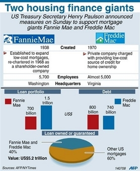 The dropping of the presidential veto threat spurred investors to snap up shares and bonds of mortgage finance companies Fannie Mae and Freddie Mac, which would receive an emergency government lifeline under the bill. The House of Representatives was expected to approve the package later on Wednesday. A White House spokeswoman said Bush will sign the measure because it is needed promptly to address the credit crisis. The White House has repeatedly expressed concern about a provision in the legislation that would provide grants to communities to buy and repair foreclosed homes. "We do not believe we have time for a prolonged veto fight," spokeswoman Dana Perino said. Shares of Fannie Mae and Freddie Mac, the nation's two biggest mortgage finance companies, surged after stock markets opened. Fannie Mae climbed 15.59 percent to $15.50, while Freddie Mac was up 9.79 percent at $10.65. Risk premiums on debt issued by the two government-sponsored mortgage companies narrowed. Yield spreads on debentures from the two agencies shaved about 2 to 5 basis points early on Wednesday. The legislation "gives support for their debt structure. It makes it easier for them to raise capital," said Priya Misra, interest rate strategist at investment bank Lehman Brothers. The housing measure comes as the US economy copes with a deep housing downturn and a credit crunch brought about by widespread mortgage failures. The latest blow to the economy was worry about the financial soundness of Fannie Mae and Freddie Mac, which own or have guaranteed almost half of the $12 trillion in US mortgage debt outstanding. Lawmakers late on Tuesday put finishing touches on the legislation and congressional budget analysts put a $25 billion potential price tag on the provision to bolster Fannie Mae and Freddie Mac, which was drafted by the Bush administration and added to a bill that has been in the works for months. The overall measure now has wide, bipartisan support in both the House and the Senate, Massachusetts Democratic Rep. Barney Frank, the chief architect of the legislation, said on Tuesday. The added provision, proposed by Treasury Secretary Henry Paulson, would give beleaguered Fannie and Freddie access to new, government capital in the form of loans or equity purchases. |