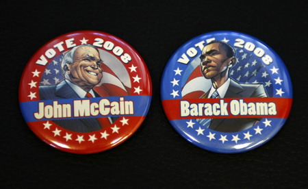 Buttons to promote the comic book biographies of US Democratic presidential nominee Senator Barack Obama (D-IL) and US Republican presidential nominee Senator John McCain (R-AZ) are seen at their publisher's office in San Diego October 6, 2008. The life stories of US presidential candidates John McCain and Barack Obama hit comic book stands on October 8 -- and the company behind the illustrated bios hopes plenty of adults will buy them. [Agencies]