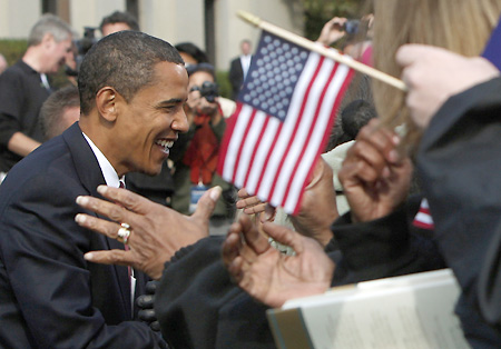 US Democratic presidential nominee Senator Barack Obama (D-IL) greets supporters at a campaign rally in Indianapolis October 23, 2008. [Agencies]