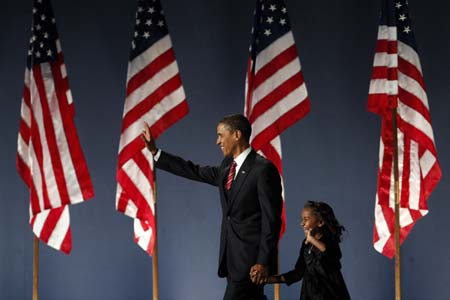 U.S. President-elect Senator Barack Obama (D-IL) comes onto the stage holding his daughter Sasha's hand on his way to speak to supporters during his election night rally after being declared the winner of the 2008 U.S. Presidential Campaign in Chicago November 4, 2008. [Agencies]