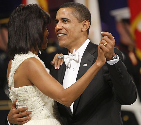 "First of all, how good looking is my wife?" Obama asked the crowd of celebrities and supporters. The US president pulled his wife close for a slow, dignified two-step to the song that marked the end of a long day of formal inaugural events and the two-year campaign that put them in the White House. Obama cut loose in a faster groove a few minutes later, as Shakira, Mary J. Blige, Faith Hill and Mariah Carey sang along with Stevie Wonder to his "Signed, Sealed, Delivered." The song was played at nearly all of Obama's rallies throughout the campaign. "You could tell that's a black president from the way he was moving," comedian Jamie Foxx joked following the dance. At most of the balls that followed, the Obamas spent little more than the length of the song greeting supporters and whirling for the crowd. But the two seemed to share intimate moments nonetheless, smiling and laughing as Michelle pulled her dress out of the way. Director Ron Howard said he sympathized with the long day Obama was having. "I feel bad for him," Howard said at the Western Ball. "He's had a long day and now he has to do seven dances. This has got to be the grueling part for the first family." Obama and Vice President Joe Biden each saluted the nation's military men and women at the Commander in Chief Ball via satellite. Biden said he wasn't looking forward to his moment on the dance floor, a familiar refrain throughout the night. "The thing that frightens me the most (is) I'm going to have to stand in that circle and dance in a minute." At that, he laughed and did a quick sign of the cross. The Obamas were more enthusiastic, splitting up to dance with Marine Sgt. Elidio Guillen of Madera, Calif. -- who was shorter than dance partner Michelle -- and Army Sgt. Margaret H. Herrera of San Antonio, Texas, who cried in the president's arms. Despite the formal attire and celebrity entertainment, the balls weren't overly fancy affairs. Lines were long to get in, and the food was heavy on vegetables with dip and cheese cubes. In a sign, perhaps, of the tough economic times, guests who already paid anywhere from $75 for a ticket to thousands more for a package deal had to buy their own drinks served in small plastic cups. Beer went for $6, cocktails for $9 and champagne for $12. People were standing in line outside Union Station to get into the Eastern States Ball an hour and a half after it started. Because of very limited seating at the Western ball, a number of attendees in long gowns and fancy dress plopped cross-legged on the floor. "This is what happens in a down economy. No chairs, no highboys -- it's the floor and plastic cups," commented ballgoer Brig Lawson, 38, of Las Vegas. At the Obama Home States ball, the dance floor was dominated by two little girls who skipped and twirled in matching red dresses while the grown-ups stood still, crowded around the stage waiting for Obama to appear. Singer Sheryl Crow was greeted by a cheering crowd later for her appropriate hit, "A Change Would Do You Good." When hip-hop star Wyclef Jean asked the men at the Mid-Atlantic Ball to pull off their tuxedo jackets and swing them in the air to show their support for Barack Obama, thousands did. At the Youth Ball, Kid Rock belted out songs as well-dressed 20-somethings mingled about. One of them walked up to a bartender, gave him a high five and said, "Barack Obama is president!" The Obamas, following Kid Rock and Kanye West, got the real rock-star reception and launched into something of an awkward dance, laughing as they swayed. When they were done, the president grabbed a mic and said, "That's what's called old school." At the Midwestern Ball, he joked that it was time to "dance with the one who brung me, who does everything that I do except backwards and in heels." And though the mood was celebratory, the reality that the country remains at war hung over the festivities at the Commander in Chief ball and a separate Heroes Red White & Blue Ball. "Please know that you are in our thoughts and prayers today, every day, forever," Obama told troops at the Commander in Chief ball. "Tonight, we celebrate. Tomorrow, the work begins. ... Together, I am confident we will write the next great chapter in America's story." |