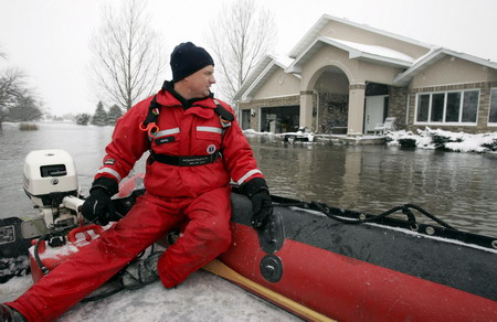 Kelly Peppel, a member of Valley Water Rescue, patrols the Oxbow housing development in a rubber boat looking for residents from houses flooded by the Red River, south of Fargo, North Dakota, March 25, 2009. [Agencies] |