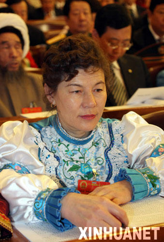 這是來(lái)自新疆的全國(guó)人大代表拉依薩·阿列克桑德洛娜(俄羅斯族)在十一屆全國(guó)人大一次會(huì)議開(kāi)幕會(huì)上。 新華社記者王建民攝