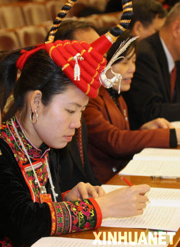 來(lái)自福建的全國(guó)人大代表雷金梅(畬族)在認(rèn)真聽(tīng)會(huì)。 新華社記者王建民攝